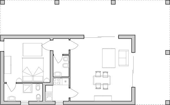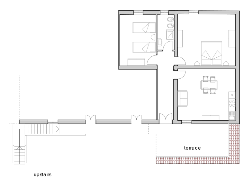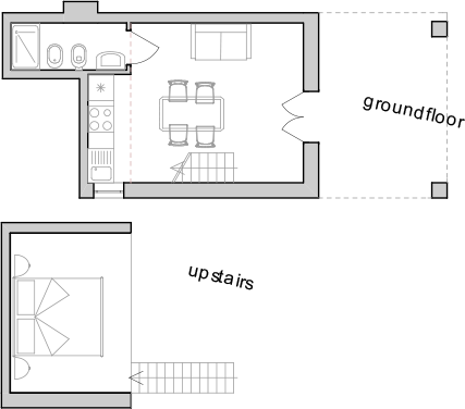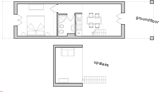 Monolocale Loft con giardino privato: di circa 20mq + 10mq di soppalco. L’appartamento è composto da cucina con divano letto ad una piazza per ragazzi massimo 14 anni, bagno con doccia, soppalco con camera matrimoniale, veranda e giardino privati con tavolo e poltroncine, aria condizionata.