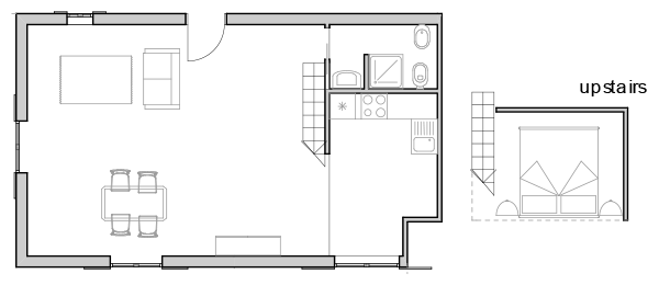 Monolocale Loft Plus: composto da cucina-soggiorno con divano letto per ragazzi massimo 14 anni, bagno con doccia, soppalco con letto matrimoniale e ampia veranda privata con tavolo e poltroncine, aria condizionata, lavastoviglie.